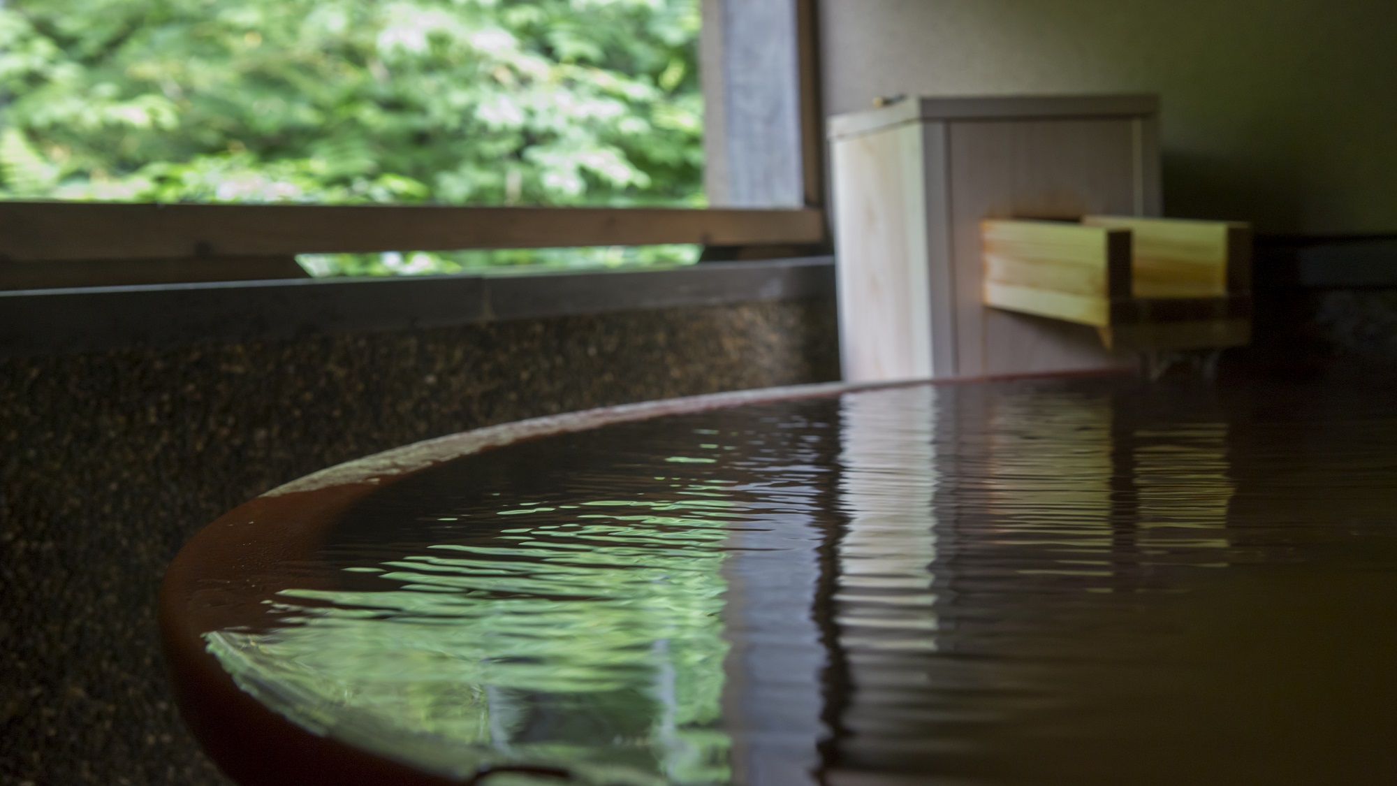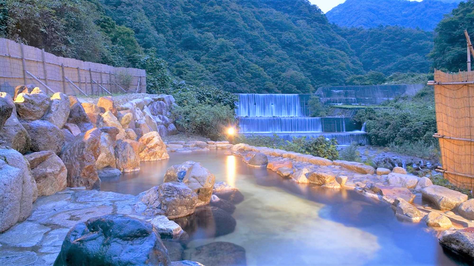 源泉掛け流しで楽しむことができ、岩風呂と檜風呂の2つの大浴場のほか、目の前に竹林や滝を望む露天風呂は貸切で楽しむことができます。