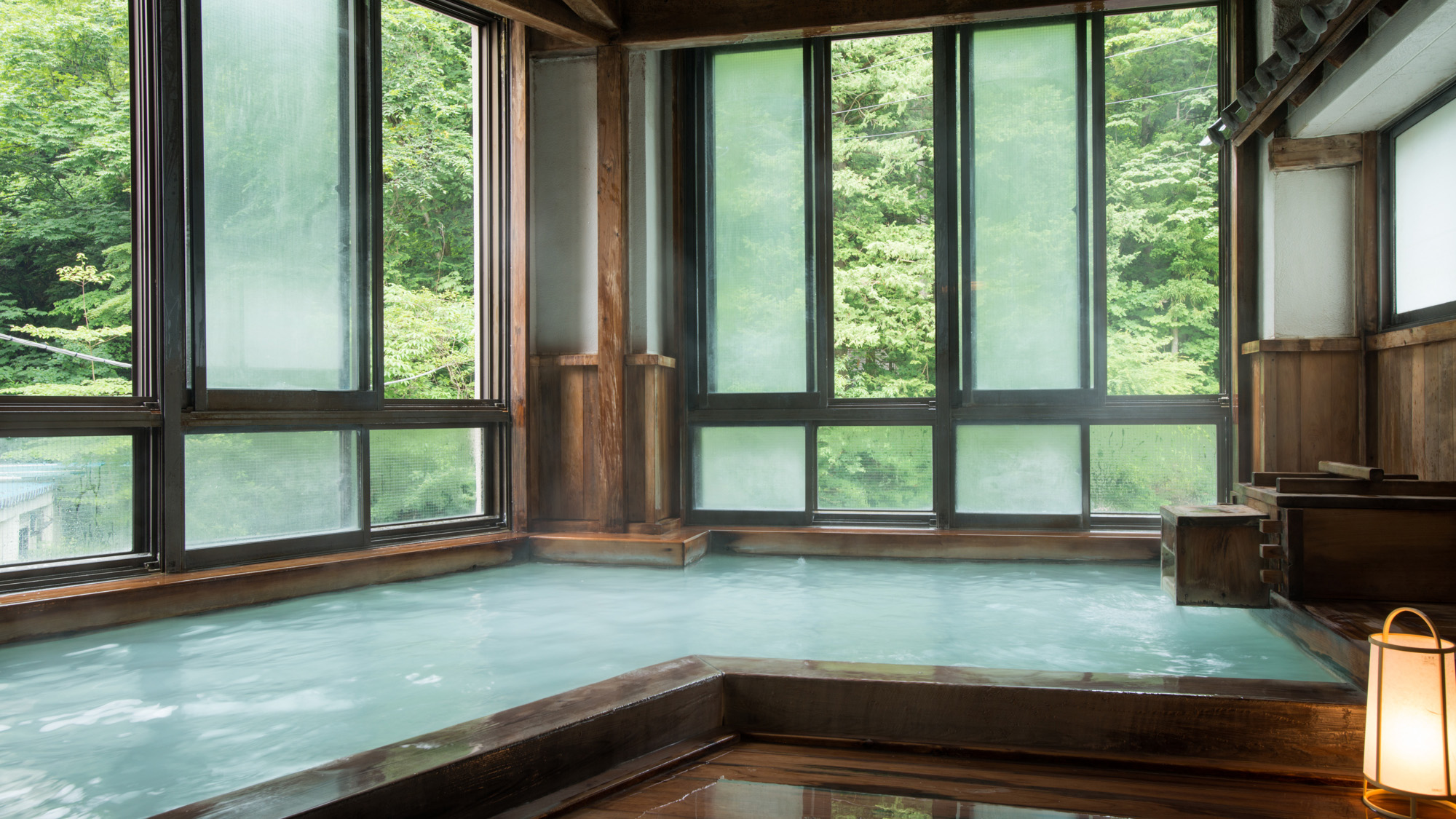 源泉掛け流しの75度の天然温泉には四季折々の渓谷を眺められる露天風呂、ヒバのウッドフロアが設られた大浴場、寝湯や蒸し風呂などもあり、温泉を心ゆくまで満喫できます。