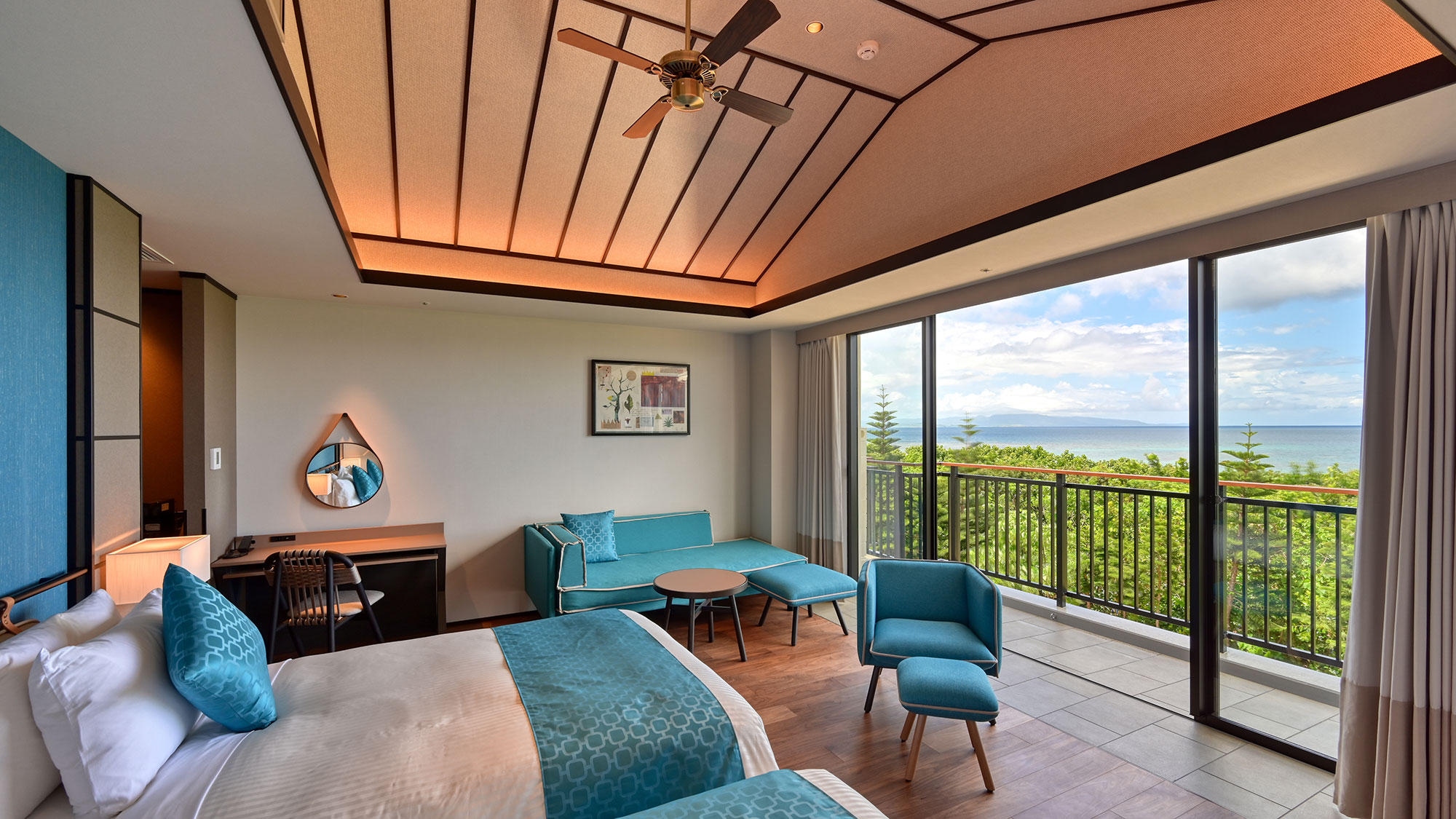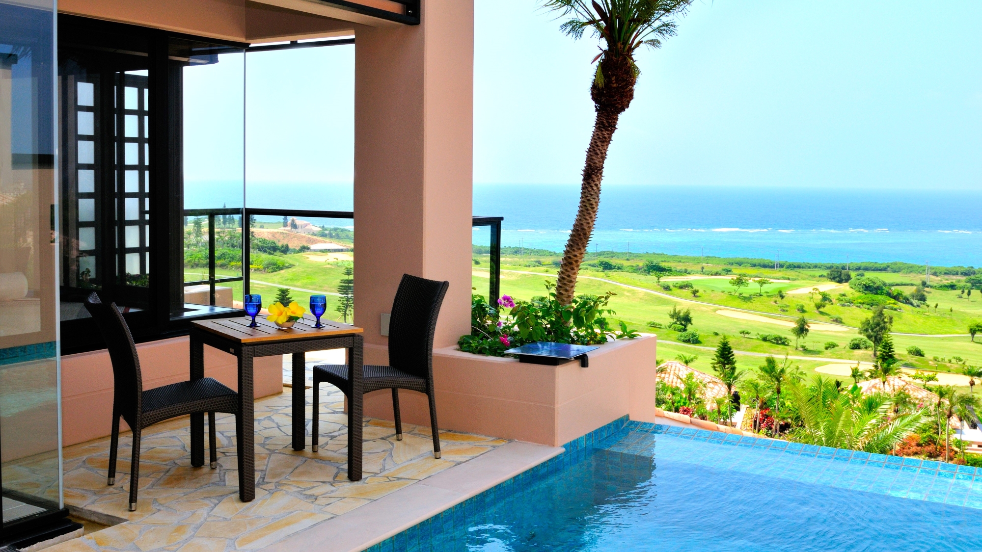 これぞリゾートホテルといった贅沢を尽くしたホテルで、客室のほぼ半数のお部屋にプライベートプールが設置され、優雅に泳ぎながら宮古島の絶景の海を眺めることができます。